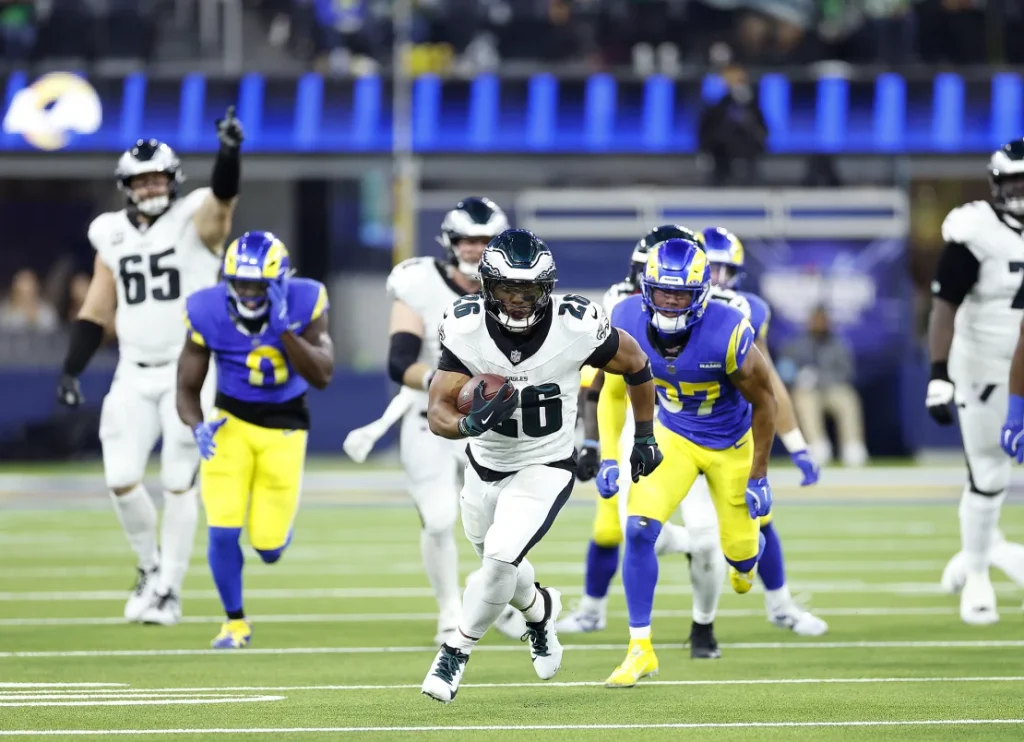 The Eagles went into halftime with a 13-7 lead before Barkley’s first long touchdown run extended the lead after the break, only for Los Angeles to cut the deficit to six points minutes later with a Matthew Stafford touchdown pass to DeMarcus Robinson.